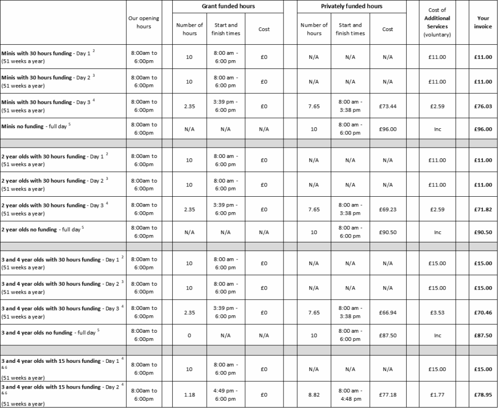 Up to 30 hours of grant funding are available for every child of working parents. This covers your child’s basic care and the delivery of the Early Years Foundation Stage (EYFS).