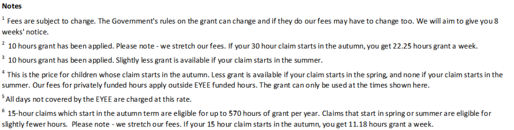 Up to 30 hours of grant funding are available for every child of working parents. This covers your child’s basic care and the delivery of the Early Years Foundation Stage (EYFS).